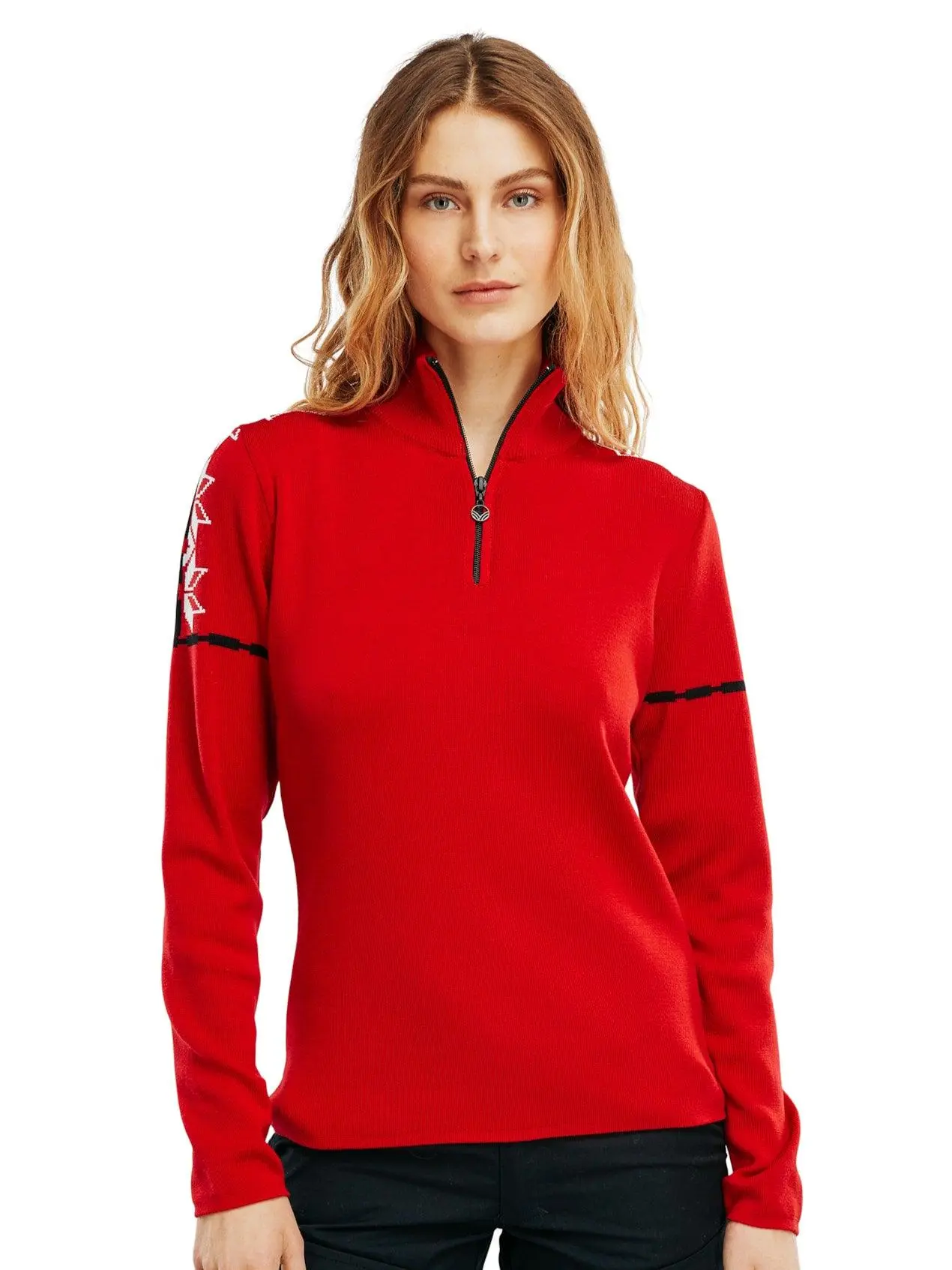 The Dale of Norway Mount Blåtind is a sporty sweater made of 100% skin soft extra-fine merino wool. The merino wool sweater features a comfortable high neck with a quarter zip. A refined version of the classic Norwegian eight-petal rose adorns the shoulders and brings hints of snow crystals and winter stars to the design.